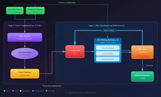- Scene-Conditional Dynamic Prior (Stage 1): Instead of starting from pure noise or discrete anchors, we train a Conditional Variational Autoencoder (CVAE) as a Prior Network. This encodes local map context ($C_{map}$) and historical trajectories ($x_{hist}$) to generate a coarse, semantically consistent starting point $x_{prior}$.